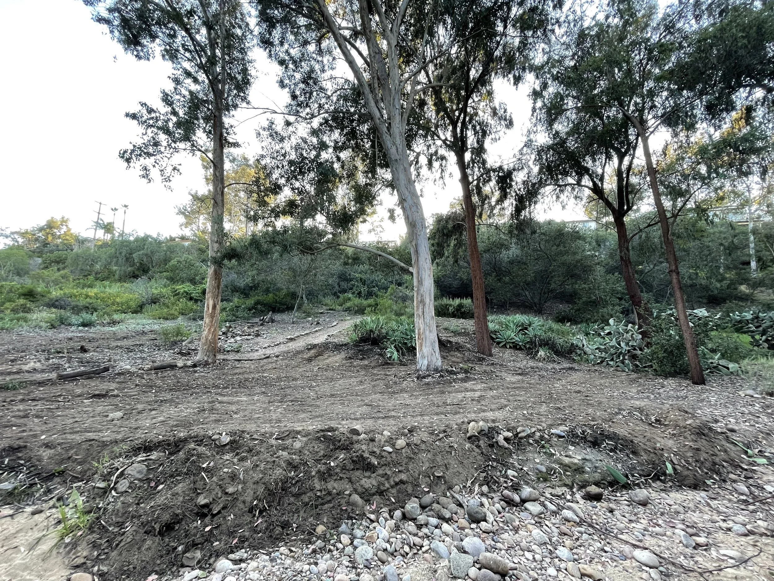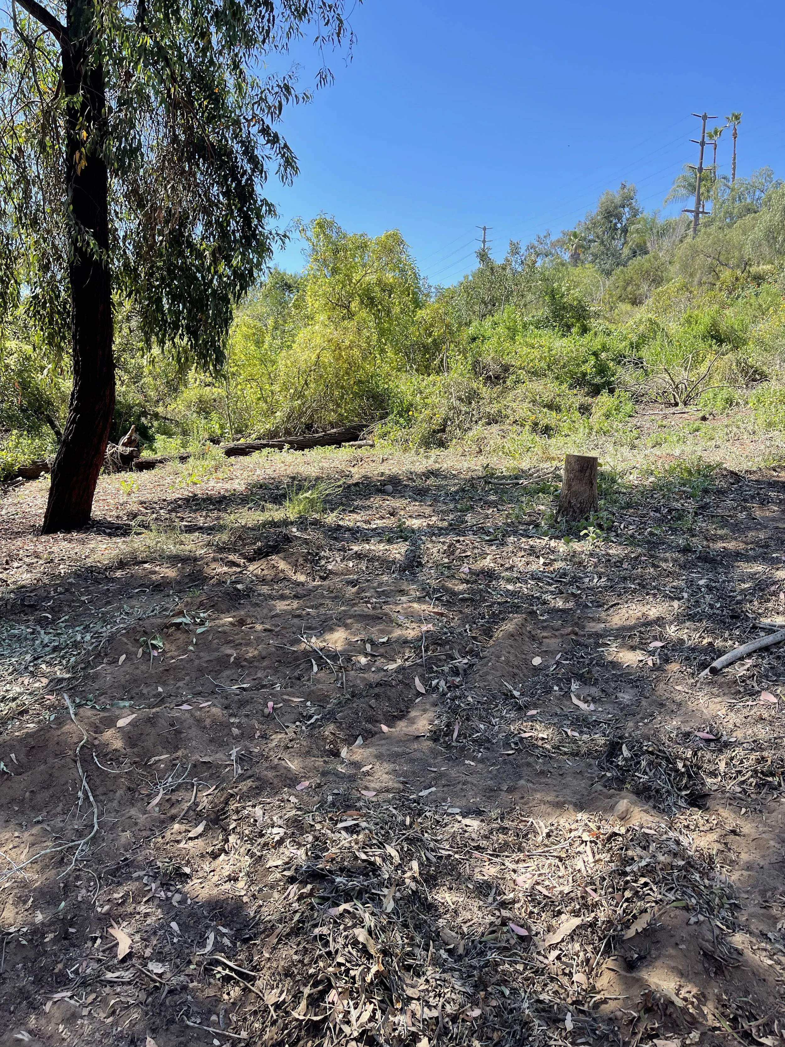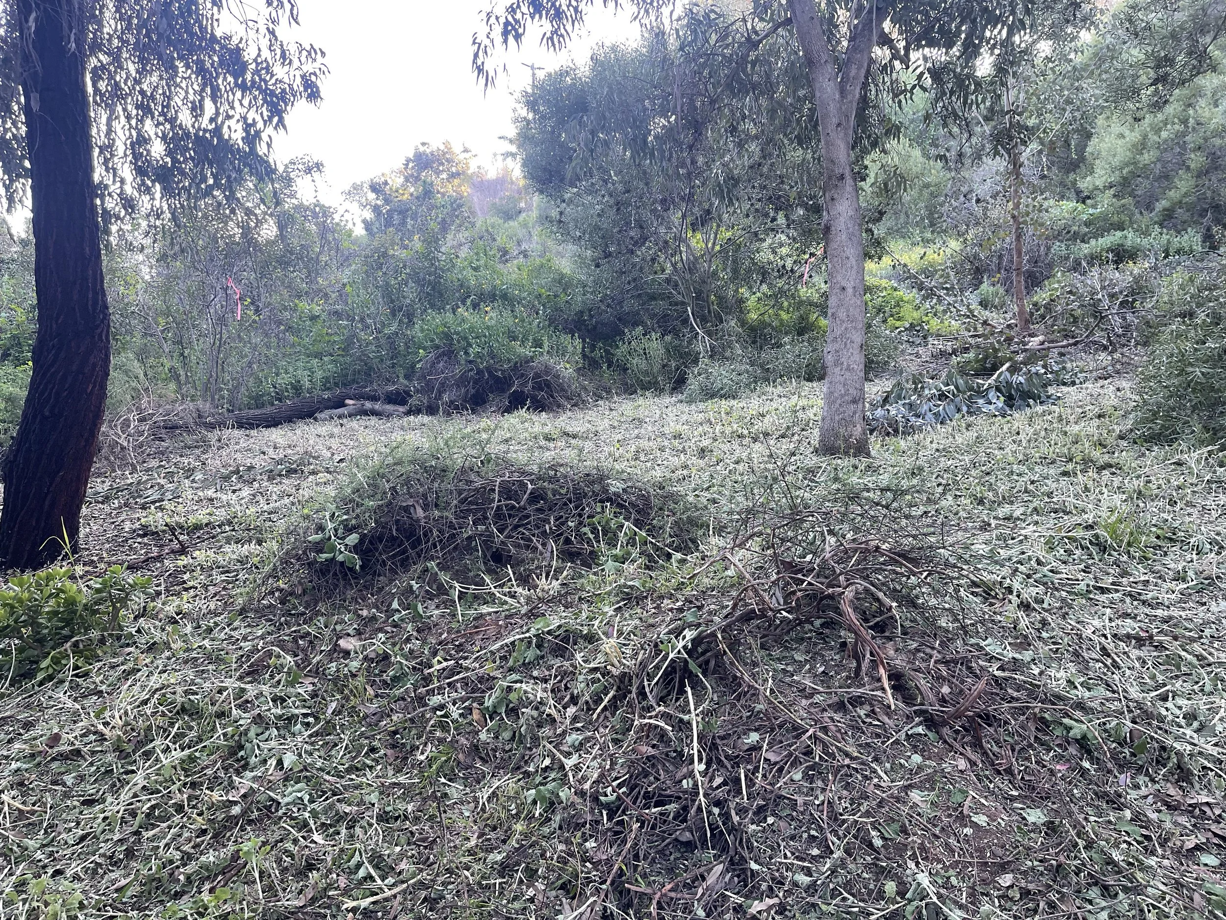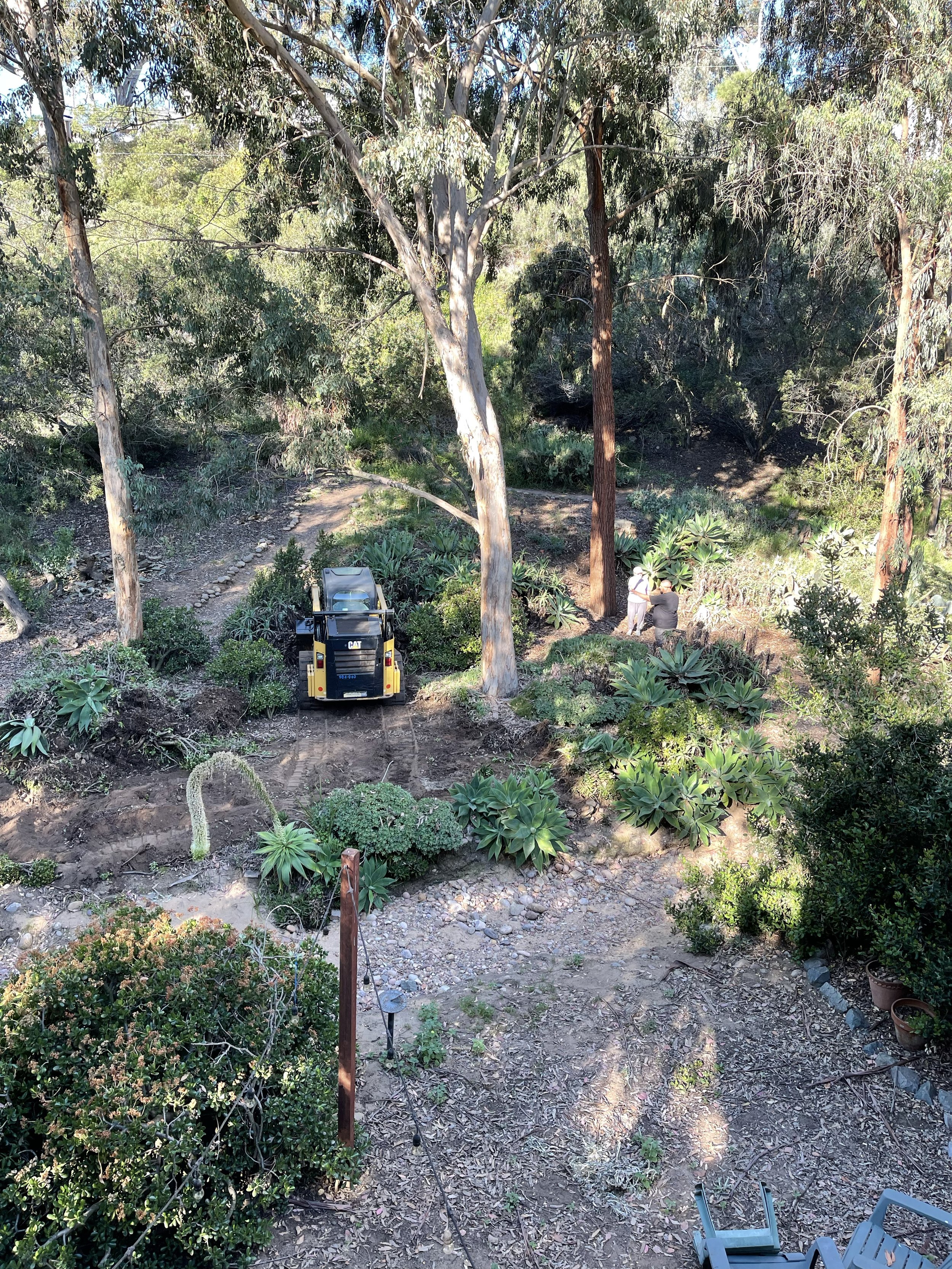 The burrows. The one remaining buckwheat. The rock trail my kids and I built stone by stone. Plants we've been nurturing for years. Gone in a few hours, scraped flat, the soil loosened and exposed. To the left of the path, a pasture-sized area was cleared — taking out a eucalyptus and two acacias in the process, invasive species so that part's a genuine win — but the debris was never even staged there. It was cleared for nothing.