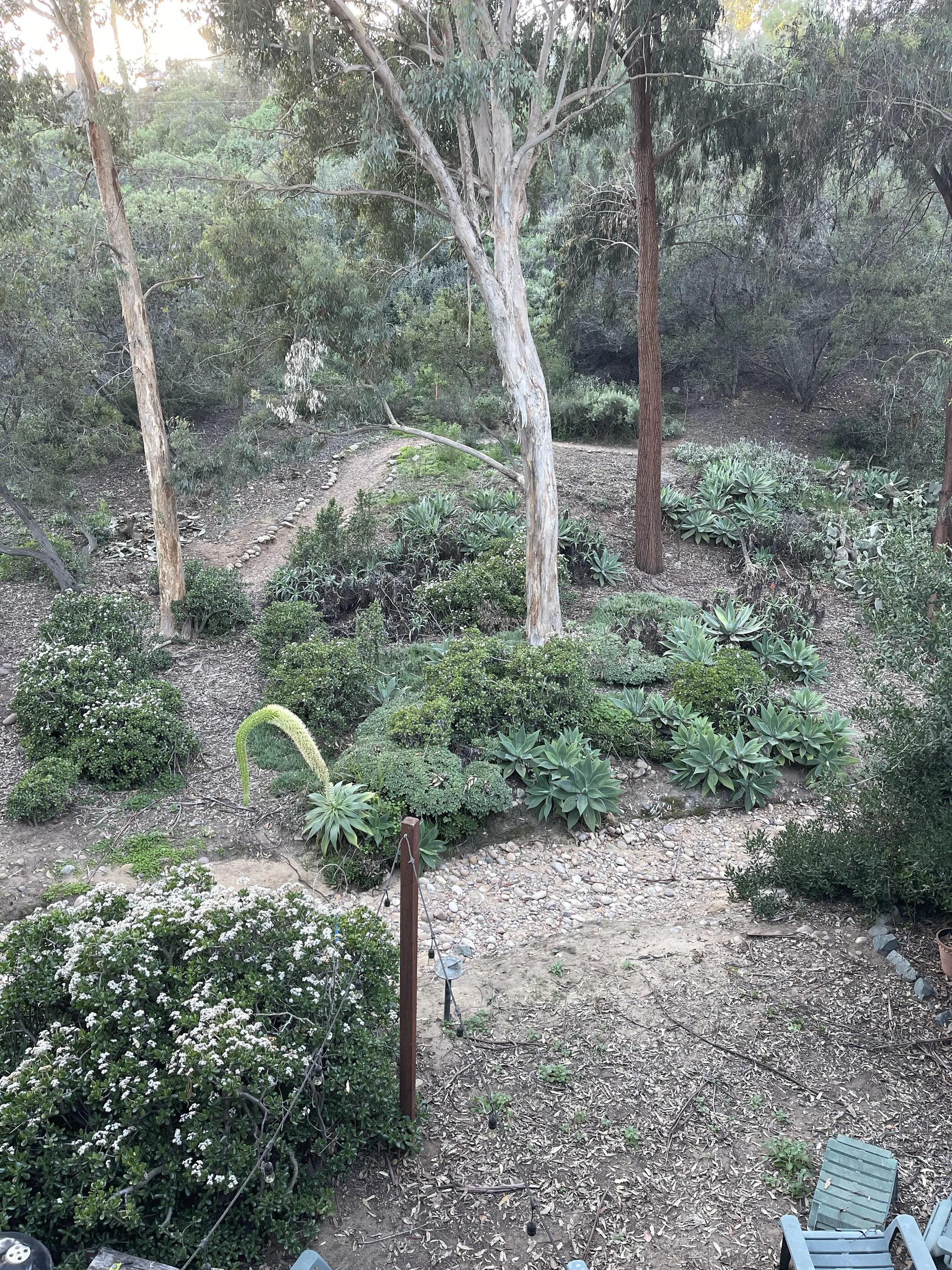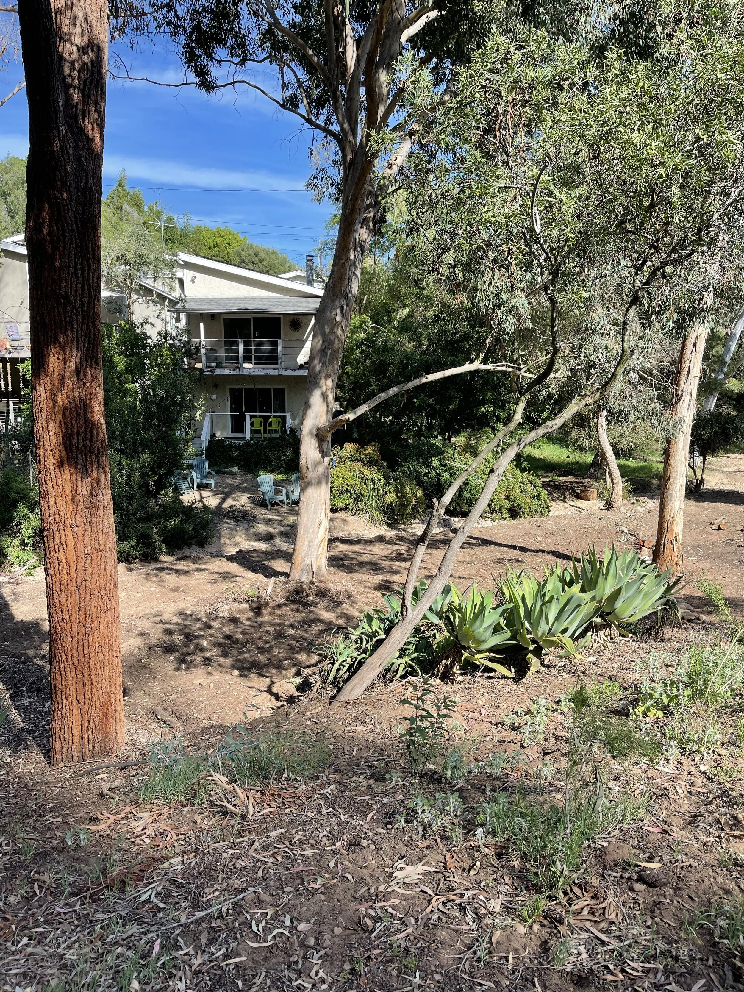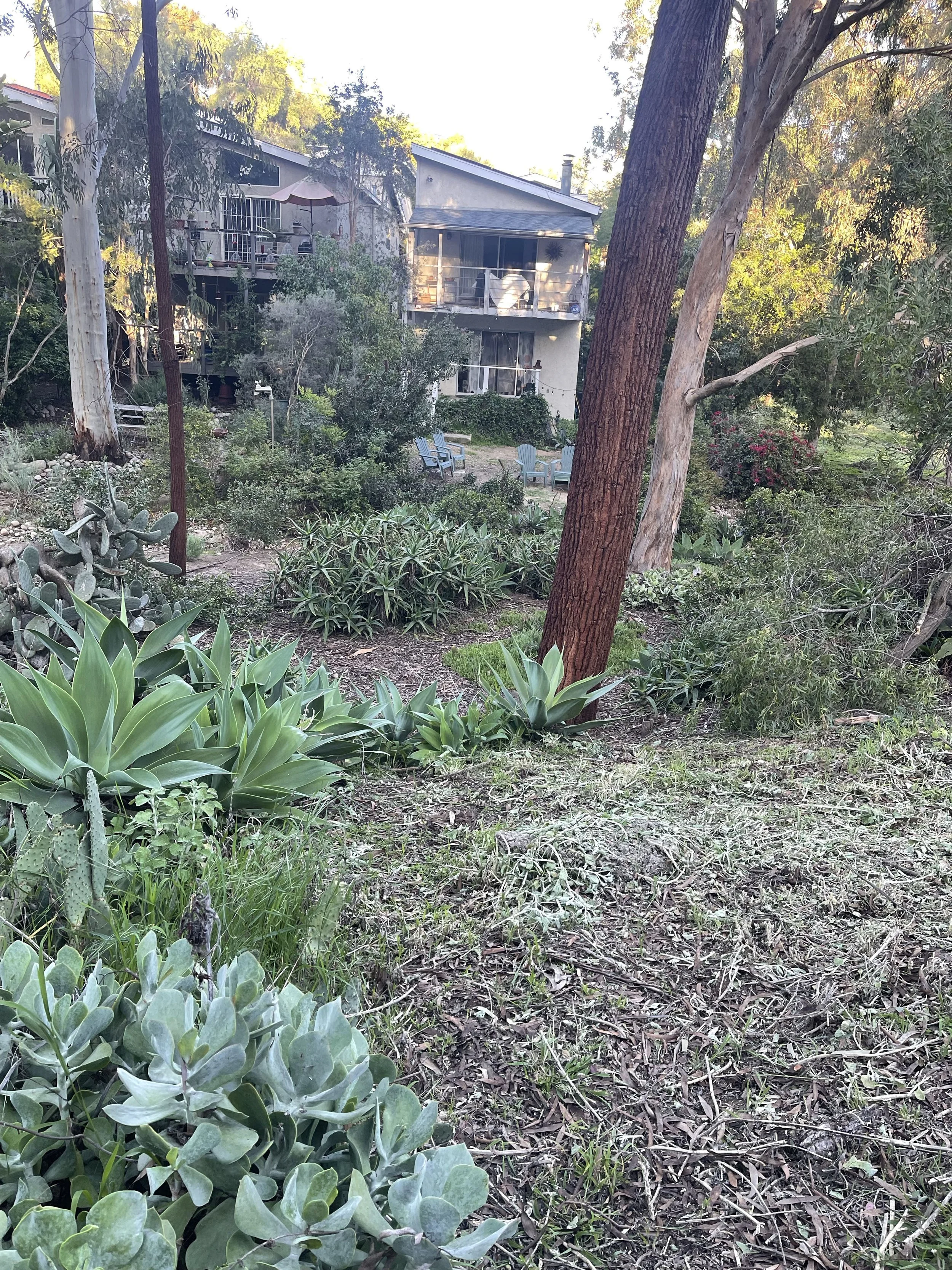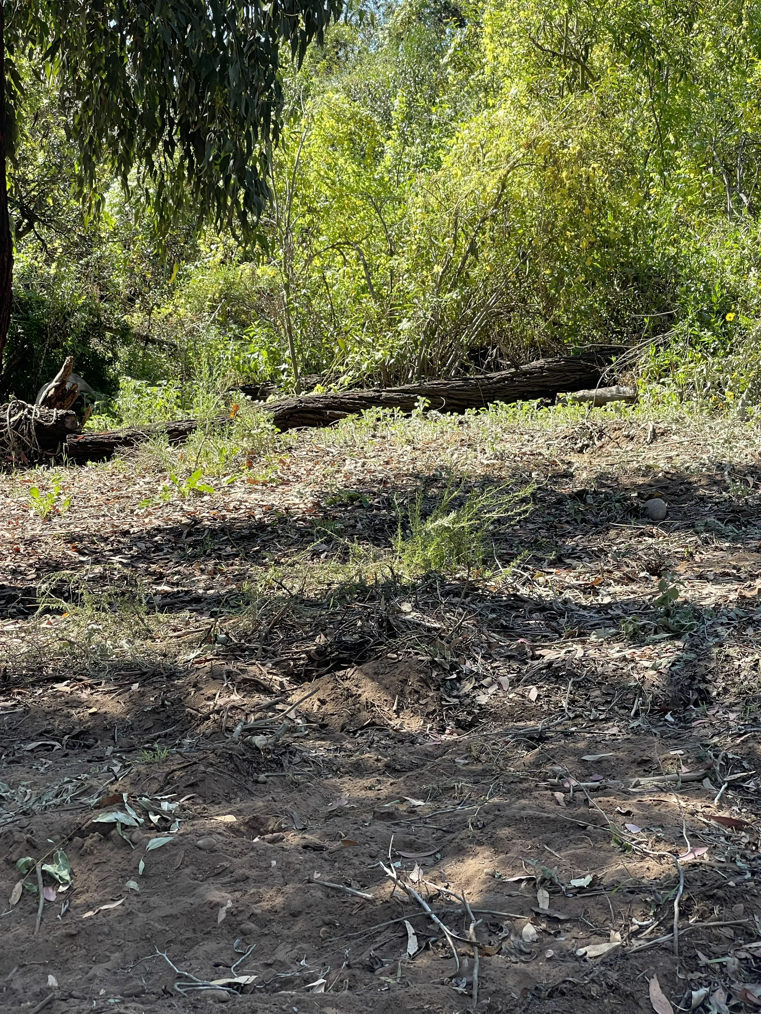 The burrows. The one remaining buckwheat. The rock trail my kids and I built stone by stone. Plants we've been nurturing for years. Gone in a few hours, scraped flat, the soil loosened and exposed. To the left of the path, a pasture-sized area was cleared — taking out a eucalyptus and two acacias in the process, invasive species so that part's a genuine win — but the debris was never even staged there. It was cleared for nothing.